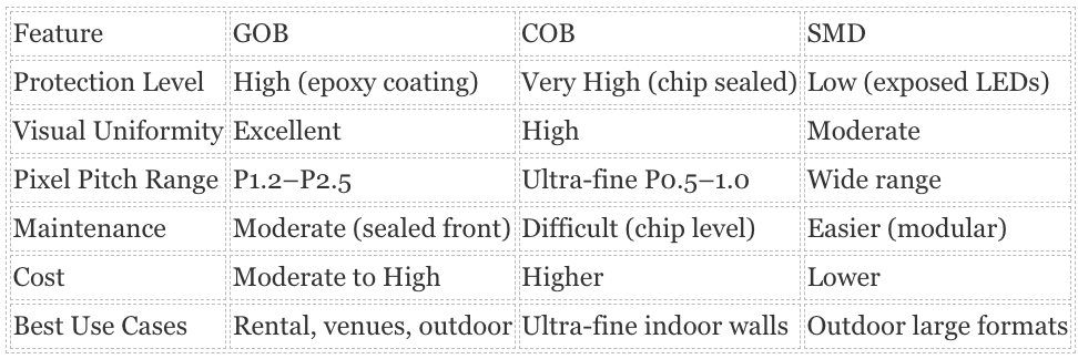 GOB fits perfectly for many mid-range pixel pitch applications — offering a solid balance between durability and image quality.